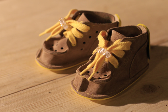 Prototyp powstał z życiowej konieczności w 1995 z jednego kawałka baraniej skórki, uszyłem je jako pierwsze buciki dla mojej małej wówczas córeczki.