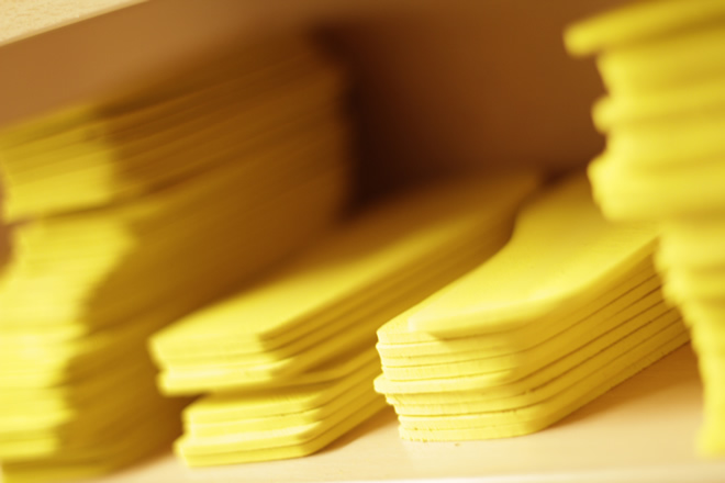Wykrojone zawsze żółte styrogumowe podpodeszwy (montowane pomiędzy spód a wyściółkę obuwia) - to w nich właśnie wybijamy dziurki