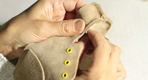 Cholewka i wyściółka bucików Gucio uszyta jest w całości z naturalnej skóry welurowej, pozyskiwanej w całości z Polskich garbarni.